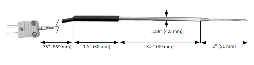 The quick responding insertion needle probe is specifically designed for monitoring food while it cooks enclosed in an oven. Durable cable with a stainless steel over-braid will repeatedly withstand most oven door closures. Insertion depth up to 5.5". Available in Type K only. Works with most thermocouple thermometers.